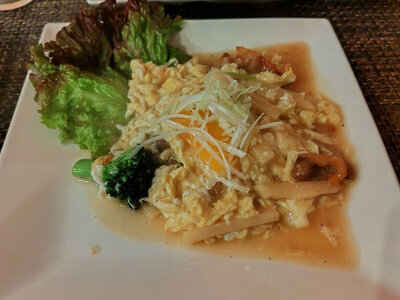 もうひとつおつまみにと、豚肉と卵の煎り付け。まあ、豚肉と卵を炒ったやつなんでしょうね。卵ふわふわで、熱々なので、ビールにも合います。
