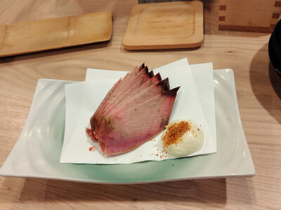 とりあえずおつまみに、海の生ハムとやら。半生鰹節らしい。まあ、美味しい事は美味しいけど、鰹節だなぁ。
