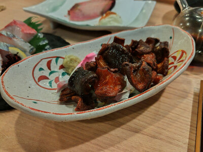 広島名物だという、せんじがら。豚のホルモンなんだそう。結構、硬いけどおつまみにはいいかも。でも顎が痛くなる。