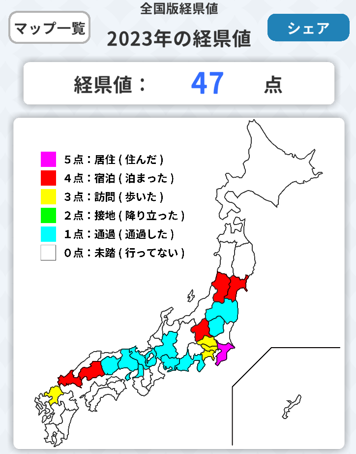 あらためておさらいですが、経県値とは、全国47都道府県の経験を6つのレベルに分けて判定したものになります。