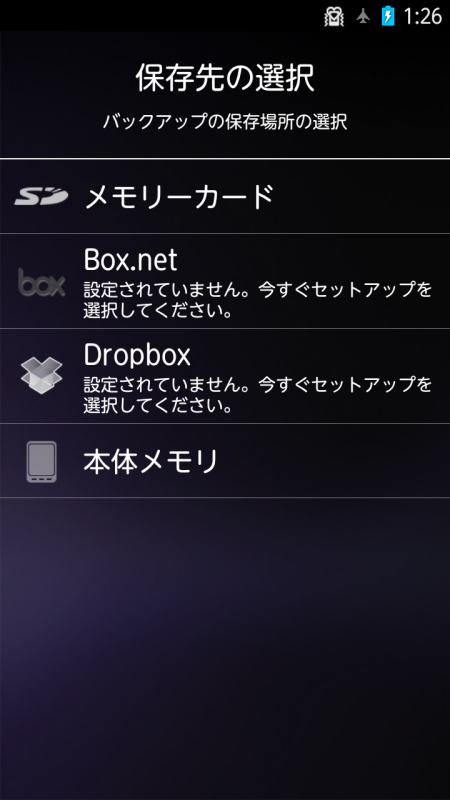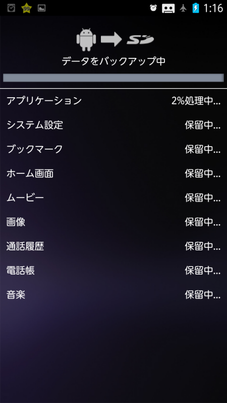バックアップ先はSDカードを指定します。とりあえず、全部バックアップします。