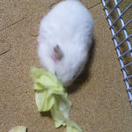 続いてアイのケージ掃除です。アイは、今日も元気な様子。エサの用意が出来て、さっそくキャベツに食いついていました。