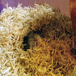 そして、コーキのケージ掃除。コーキは、またもやかくれんBOXに篭って出てきません。かくれんBOXをばらして出てくるのを待ってましたが、床材をもぐって逃げ込んでしまいました。床材から少しだけ顔を出して覗いてるところです。