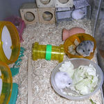 ケージに戻って、今度は乾燥キャベツに集まっている仔ハムたちです。そして、みな各々動き回ってます。この風景も今日で見納めです。