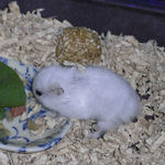 ケージ掃除が終わって、エサの時間です。さっそく、ちびっこクロワッサンに食いついていました。