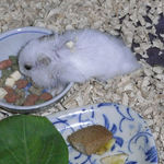 ケージ掃除が終わって、エサの時間です。さっそく、ひとくちチーズに食いついていました。