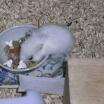 それから、コー太のケージ掃除です。今日も元気一杯なコー太です。昨夜から、回し車をドワーフ用サイレントホイールから、一回り大きいくるくるフラワーに変えました。最初は、戸惑ってたけれど、すぐに勢いよくまわしだしました。