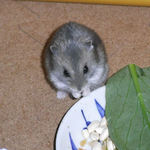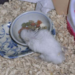 掃除のあいだ、サークル内をよろよろと歩き回ってました。エサの用意が出来て、さっそくエサ皿に向かっているアイです。