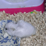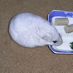 ケージ掃除が終わって、エサの時間。さっそく、豆腐を食べているましろです。