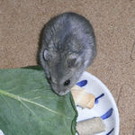 ケージ掃除が終わって、エサの用意ができました。あまり、好みのエサはないようだけれど、とりあえず小松菜に食いついていました。