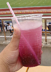 ん~、微妙な味。デカビタみたいな味。カキ氷のシロップっぽくもある。紫色はどこから出てるんだろうか!?