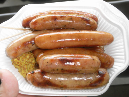 13時前にはフクアリ前に到着。あまりにいい天気だったんで、ソーセージ盛りを買って一杯やろうかなという気分だったんで、さっそく喜作で買ってから入場待ちの列に並びました。