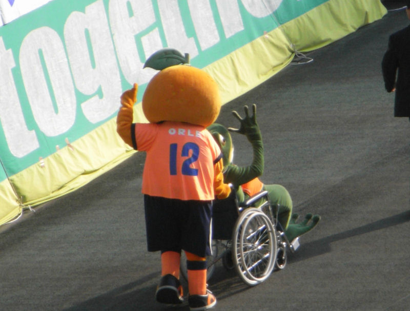 愛媛のマスコットたちが場内を一周していた。一平くんは車椅子姿で登場だ。