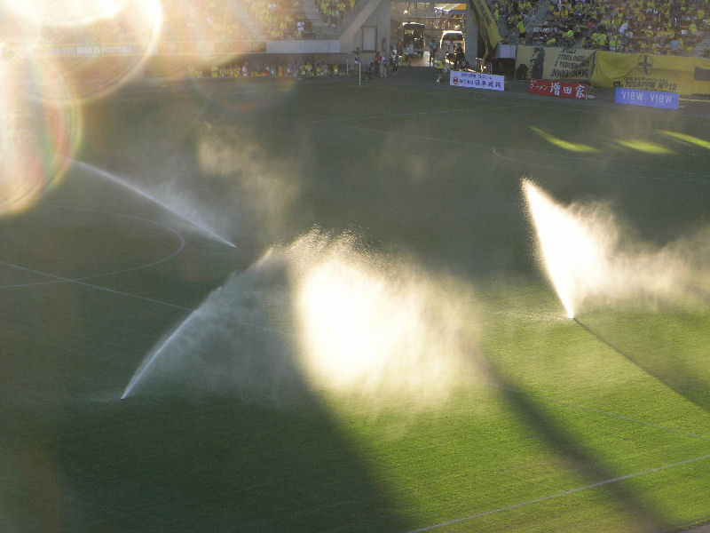 それにしても暑いです。フクアリ恒例の散水もまだ日が残ってる時間でした。