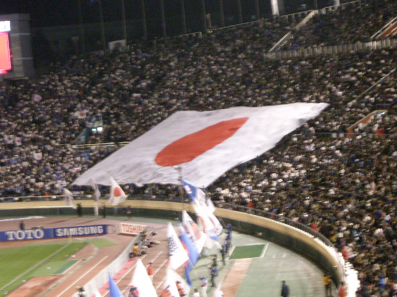 日の丸の旗を配っていたらしくて、あちこちで振られていた。ホーム側のゴール裏も、ジャパンブルーよりも、日の丸で白っぽい感じになっていた。