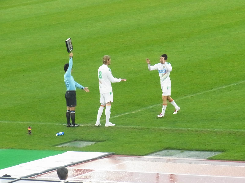 なかなか追加点が奪えない中、荒田が負傷であしをひきづっている。前半23分、荒田に代えて大塚を投入する。