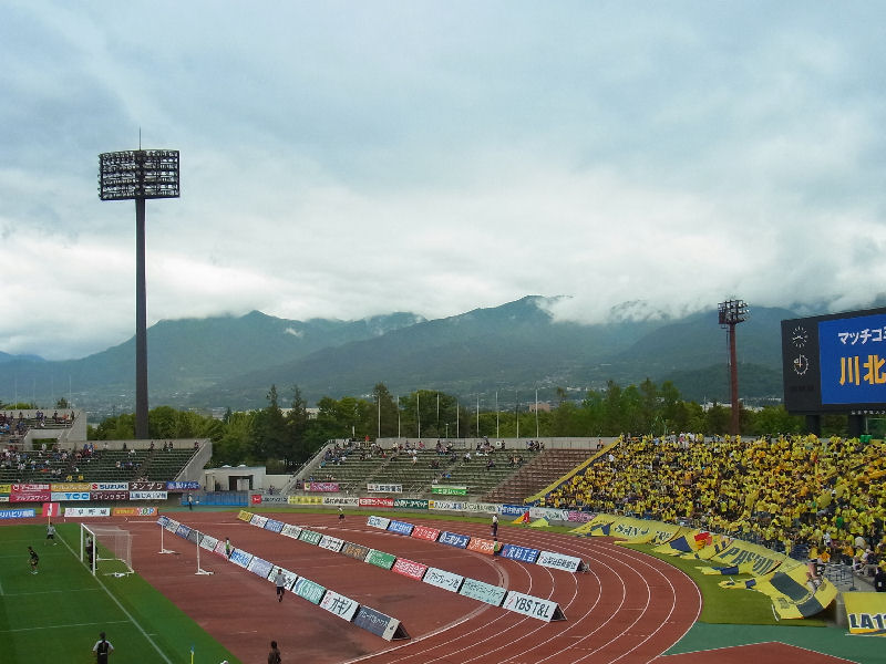 小瀬のこのスタジアムは、バックスタンド方面に見える山々がなかなかいい景色で、いつも写真に撮ってしまう。