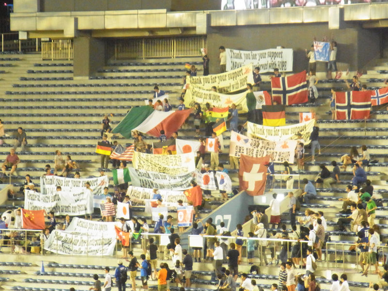 今大会、様々な会場で各国の国旗や各国語でのバナーが掲げられていたが、表彰式ではゴール裏に集結していた。