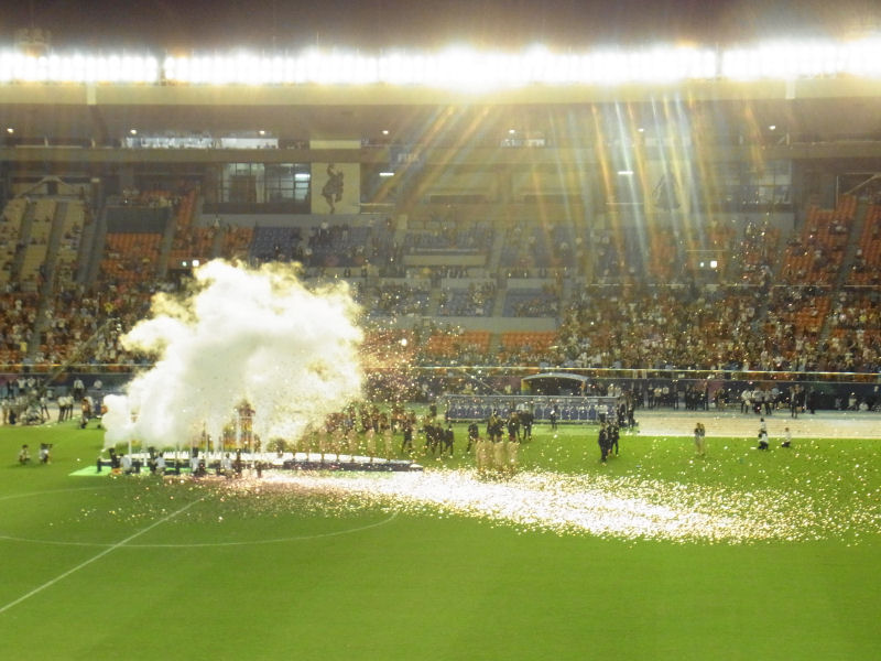 キャプテンにカップが渡されると、ド派手に紙吹雪がまって、場外からは花火が打ち上げられた。(残念ながらバックスタンドの上の方にいたので花火はほとんど見えなかったのだが。)