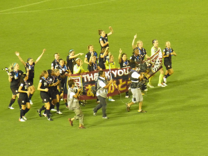 記念撮影の後に、U-20アメリカ女子代表がバナーを掲げて場内を一周。普通なら歩いて場内を一周するところなんだが、彼女らは思いっきりダッシュで場内一周して、喜びを爆発させていた。
