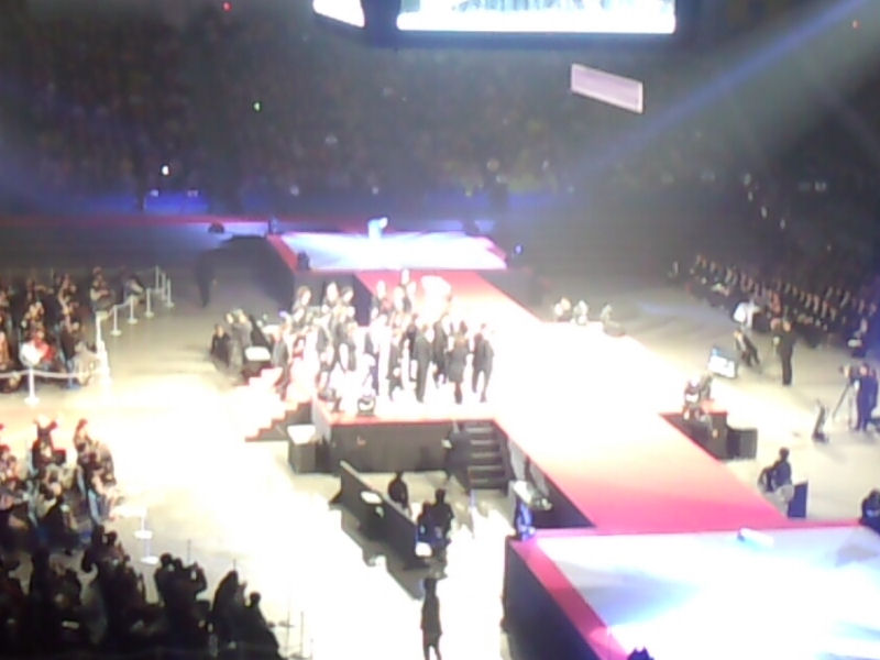 19時からの表彰式を前に腹ごしらえ。席では飲食出来ないので、コンコースでおにぎり食べてました。コンコースに備え付けられているモニターで、中継が流れていてちょうど智のインタビューをやってました。