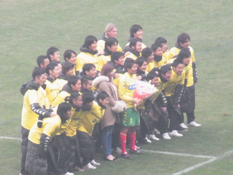 その後、選手全員が出てきての記念撮影。「ありがとう隊長!」の記念Tシャツで出てきてくれたのだが、ベンチコートでもこもこになった上にTシャツだったので、これが少し滑稽に見えて笑いがおこる。