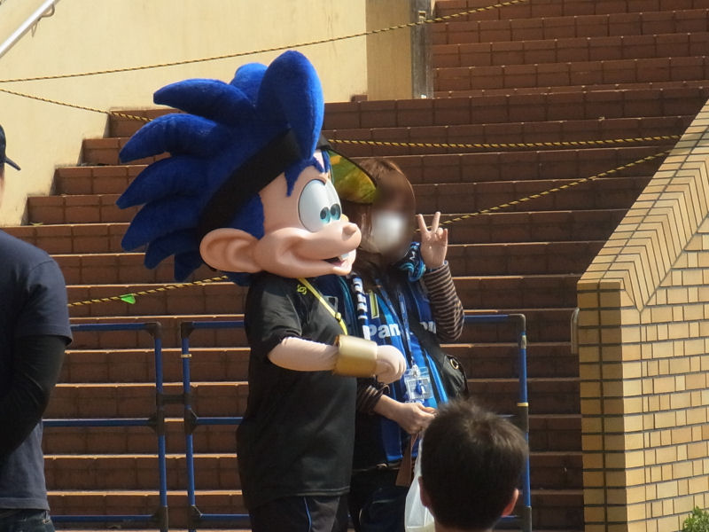ゴール裏ではなく、メインスタンド側の席だったので、アウェイよりの出入り口を目指していたところ、ガンバボーイ発見。ユニフォームじゃないのね。