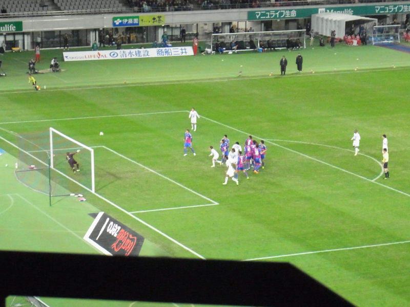 前半20分のFKは跳ね返される。その流れからファウルがあり、再度のFKも東京が防ぎきる。