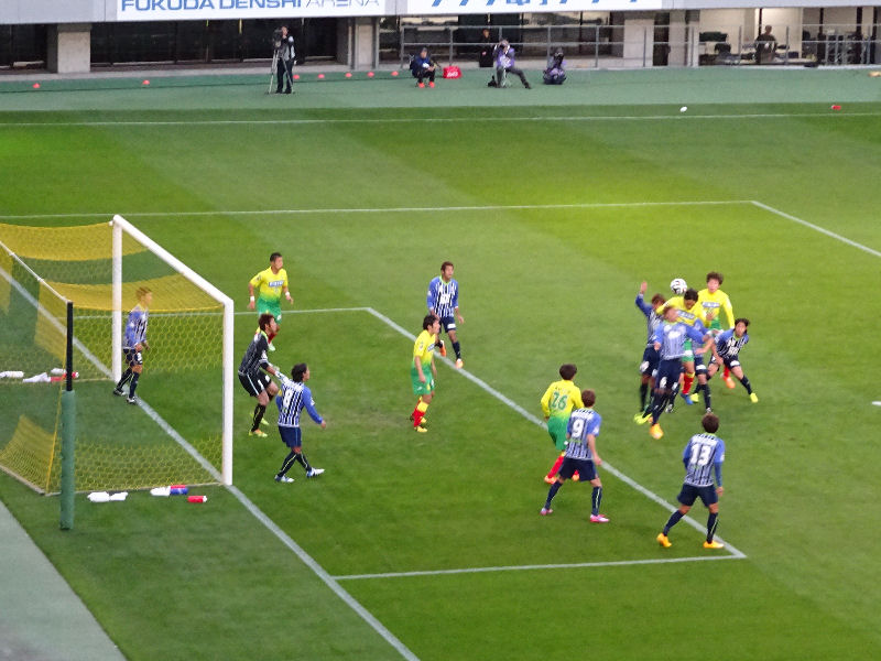 後半3分、ジェフは左サイドからのFK。森本が頭で合わせるものの枠を外れます。
