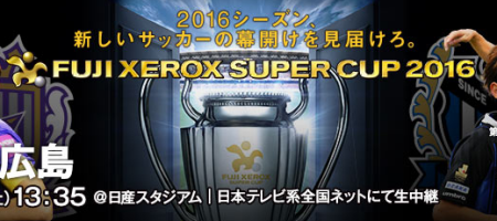 FUJI XEROX SUPER CUP 2016 サンフレッチェ広島vsガンバ大阪の試合をテレビ観戦しました。前半は両チームともに無得点でしたが、広範囲入って広島が寿人のゴールで先制。さらに、PKから1点を追加。ガンバは宇佐美の得点で1点を返すが、広島が追加点を上げて3-1で勝利した。 -