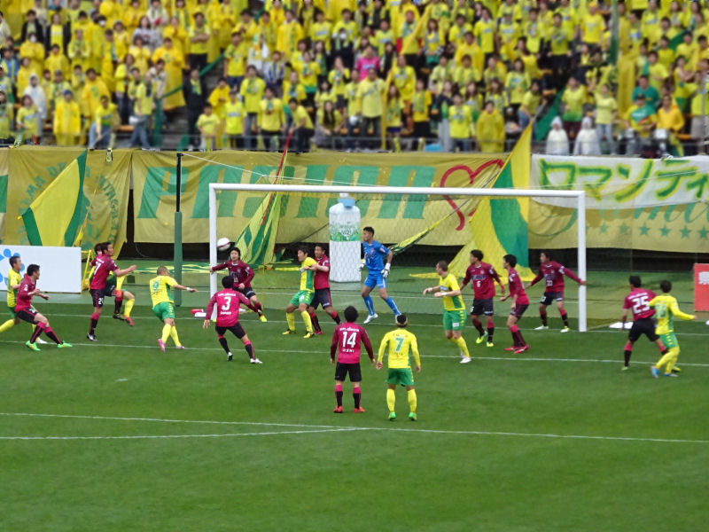 前半28分、ジェフのCKに森本がヘディングで合わせるもののわずかに枠を外れます。