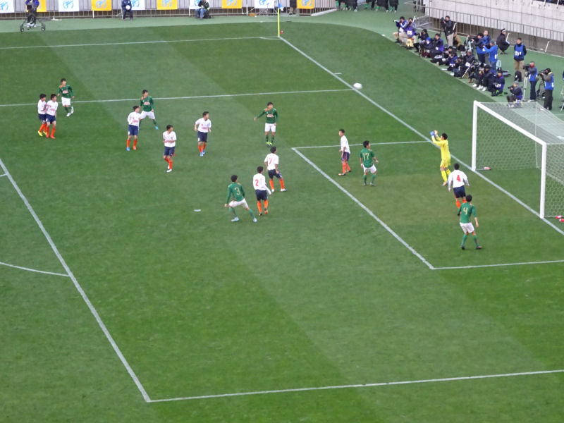 後半18分、青森山田のFK。直接狙うが、わずかに左に外れる。