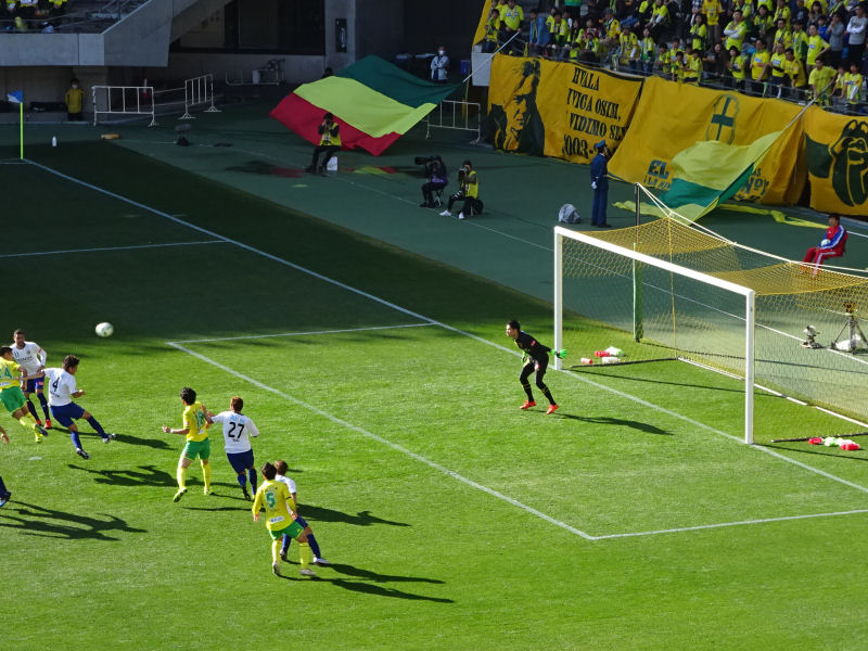 後半34分、柏が左サイドからのFK。ヘディングシュートはわずかにバーをこえる。