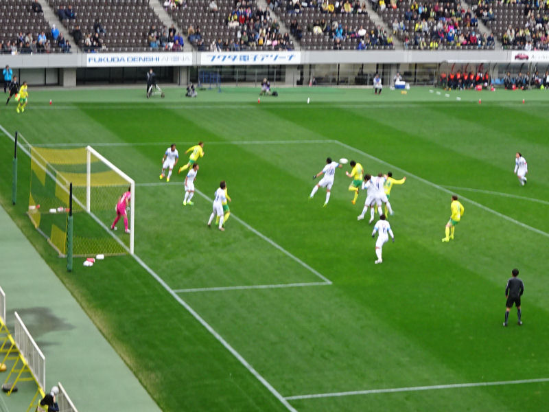 前半12分、横浜FCが右からのクロスにヘディングで合わせるが、これは防ぎきる。さらに、前半13分、横浜FCのCK。相手のファウルとなり助かる。
