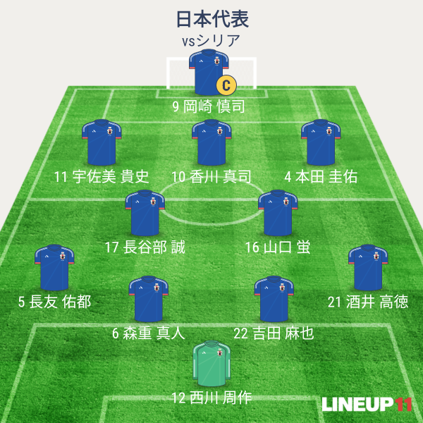 日本の先発は、GKに西川、CBに吉田と森重、右SBに酒井高、左SBに長友、ボランチに長谷部と山口蛍、右SHに本田、左SHに宇佐美、トップ下に香川、1トップに岡崎という布陣でした。本田、香川、宇佐美が先発起用されています。この試合が代表100キャップ目となる、岡崎がゲームキャプテンに選ばれました。