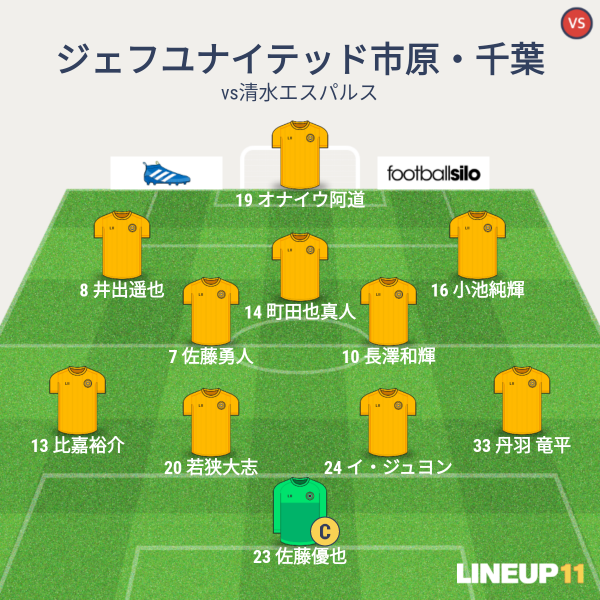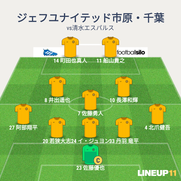 ジェフは、4バックとなり、北爪が右SH、井出が左SH、トップ下に町田でワントップに船山となる。