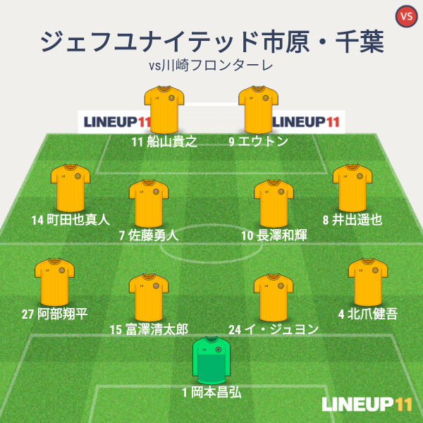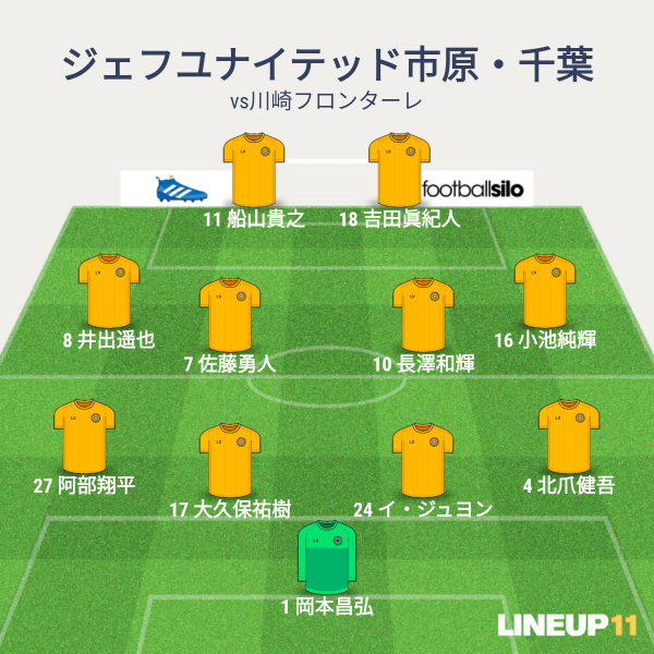 ジェフの先発は、GKに岡本、CBに大久保とジョユン、右WBに北爪、左WBに阿部、ダブルボランチに勇人と長澤、右SHに小池、左SHに井出、2トップに船山と吉田という布陣でした。