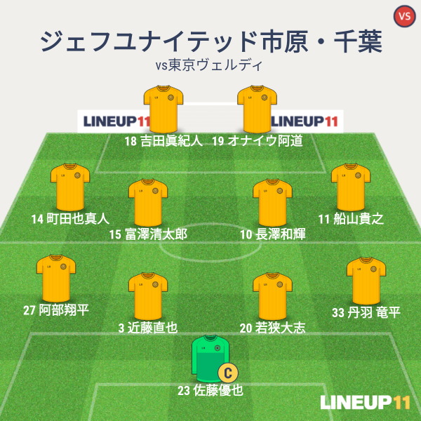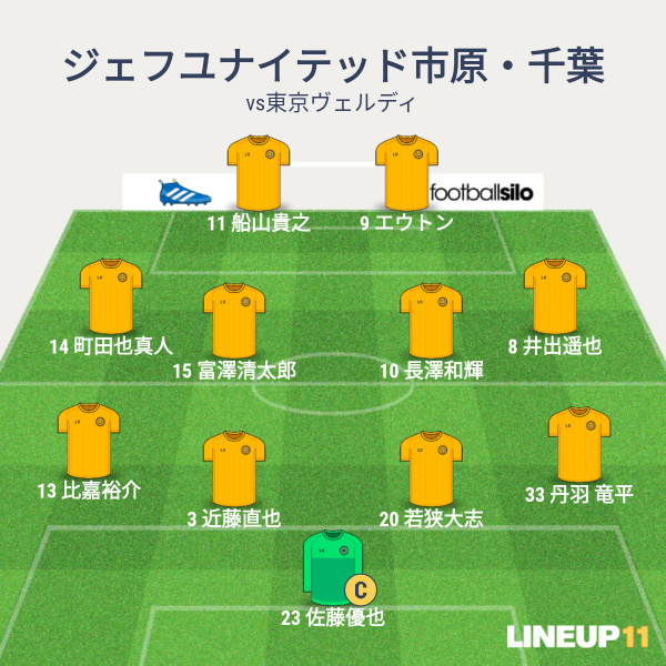 ジェフの先発は、GKに優也、CBに近藤と若狭、右WBに丹羽、左WBに比嘉、ダブルボランチに富澤と長澤、右SHに井出、左SHに町田、2トップにエウトンと船山という布陣でした。