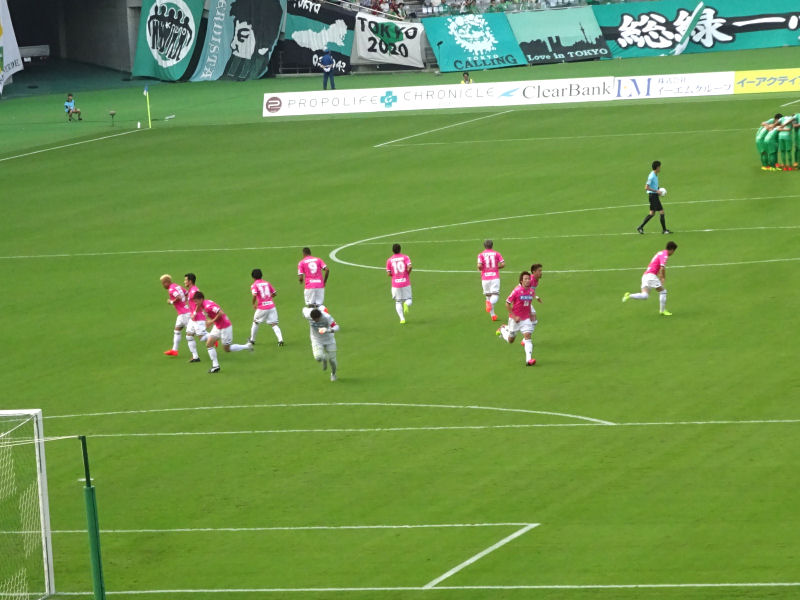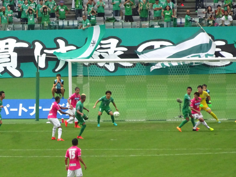 前半24分、ヴェルディが左サイドからクロスもクリアしてCKに。このCKから、アラン・ピニェイロがボレーで蹴り込んでゴールを奪い、ヴェルディが先生する。