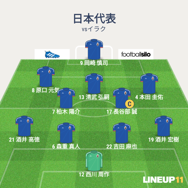 日本の先発は、GKに西川、CBに吉田と森重、右SBに酒井宏、左SBに酒井高、ボランチに長谷部と柏木、右SHに本田、左SHに原口、トップ下に清武、1トップに岡崎という布陣でした。トップ下に清武が起用されています。
