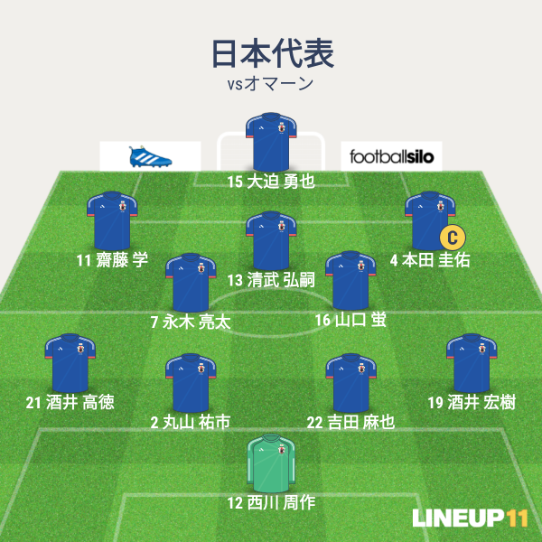 日本の先発は、GKに西川、CBに吉田と丸山、右SBに酒井宏、左SBに酒井高、ボランチに山口と永木、右SHに本田、左SHに斎藤、トップ下に清武、1トップに大迫という布陣でした。CBに丸山、ボランチに永木、SHに斎藤、トップに大迫と新しい選手を入れてきました。