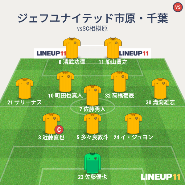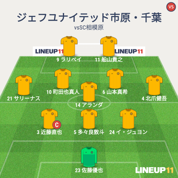 ジェフの先発はGKに優也、CBにジュヨン、多々良、近藤、アンカーにアランダ、ISHに真希と町田、右WBに北爪、左WBにサリーナス、2トップに船山とラリベイとなりました。近藤が3バックの中央ではなく左。中央には多々良が入りました。サリーナス、ラリベイの新外国人選手がそろって先発となりました。