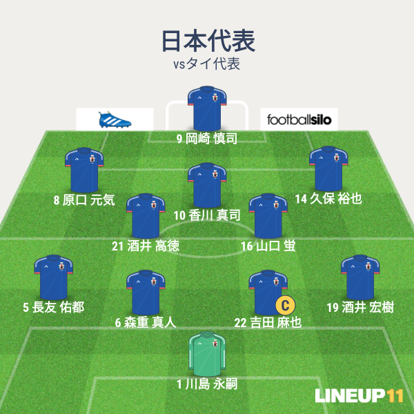 日本の先発は、GKに川島、CBに吉田と森重、右SBに酒井宏、左SBに長友、ボランチに山口、酒井高、トップ下に香川、右SHに久保、左SHに原口、1トップに岡崎という布陣でした。酒井高徳がボランチとして出場。トップには岡崎が入りました。