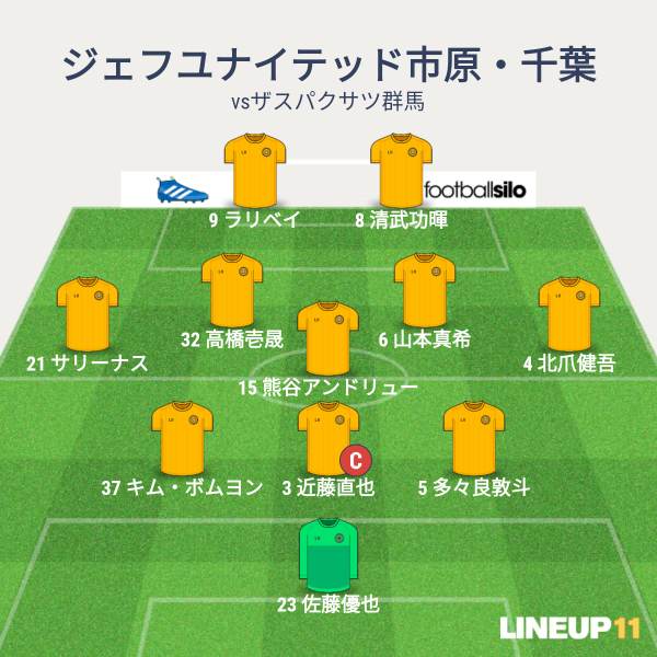 ジェフの先発は、GKに優也、CBに近藤、ボムヨン、多々良、アンカーに熊谷、ISHに真希と壱晟、右WBに北爪、左WBにサリーナス、2トップに清武とラリベイという布陣でした。CBの一角に多々良を起用してきました。サリーナスも先発に復帰しています。