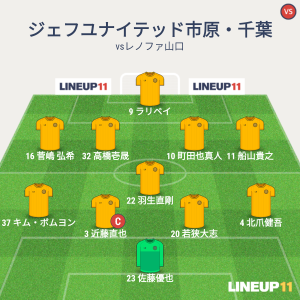 ジェフの先発は、GKに優也、CBに若狭、近藤、ボムヨン。アンカーに熊谷、ISHに町田と壱晟、右WBに北爪、左WBにサリーナス、2トップに船山と清武という布陣でした。若狭がスタメン復帰。町田も先発出場となりました。