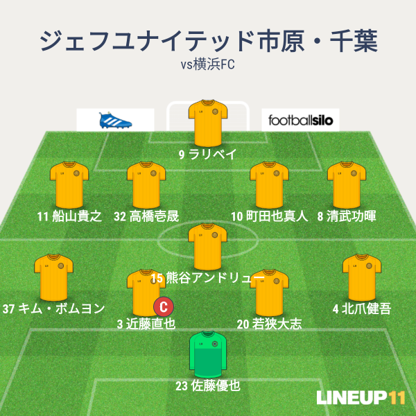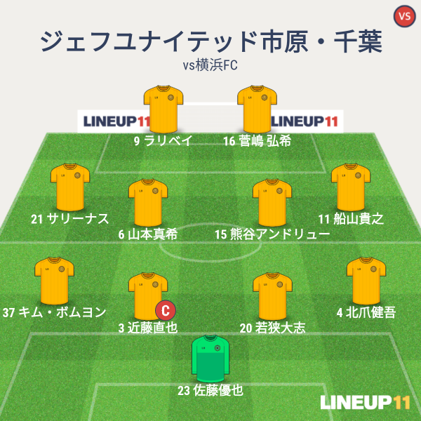 ジェフの先発は、GKに優也、CBに近藤、若狭、右SBに北爪、左SBにボムヨン、アンカーに熊谷、ISHに町田と壱晟、右SHに清武、左SHに船山、1トップにラリベイという布陣でした。今シーズン初めて4バックでのスタート。ラリベイの1トップという形できました。