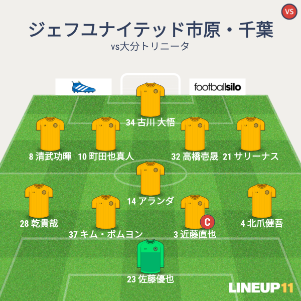 ジェフの先発は、GKに優也、CBに近藤、ボムヨン、右SBに北爪、左SBに乾、アンカーに熊谷、ISHに町田と壱晟、右SHに船山、左SHに清武、1トップにラリベイという布陣でした。指宿は怪我のためか欠場。ラリベイが先発となりました。船山がスタメンに復帰。ボムヨンが4バックのCBで出場となりました。