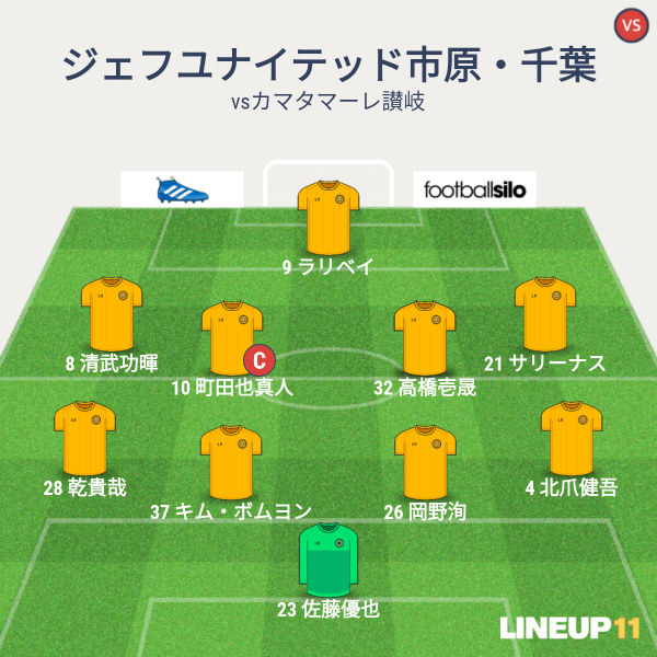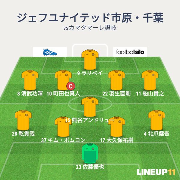 ジェフの先発は、GKに優也、CBに大久保、ボムヨン、右SBに北爪、左SBに乾、アンカーに熊谷、ISHに町田と羽生、右SHに船山、左SHに清武、1トップにラリベイという布陣でした。近藤に代わって大久保が先発。羽生が移籍後初先発となりました。