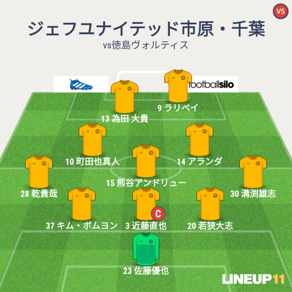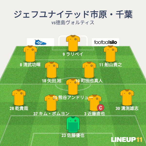 ジェフの先発は、GKに優也、CBに近藤とボムヨン、右SBに溝渕、左SBに乾、アンカーに熊谷、ISHに町田と矢田、右SHに船山、左SHに清武、1トップにラリベイという布陣でした。アンカーに熊谷が復帰。矢田が初先発となりました。清武が先発に復帰しています