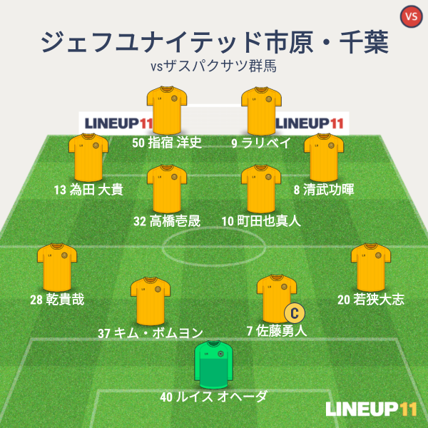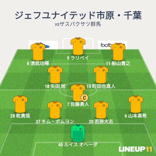 ジェフの先発は、GKにルイス、CBに若狭とボムヨン、右SBに真希、左SBに乾、アンカーに勇人、ISHに町田と矢田、右SHに船山、左SHに清武、1トップにラリベイという布陣でした。船山、ボムヨンが先発に復帰、近藤出場停止のところには若狭がそのまま入りました。